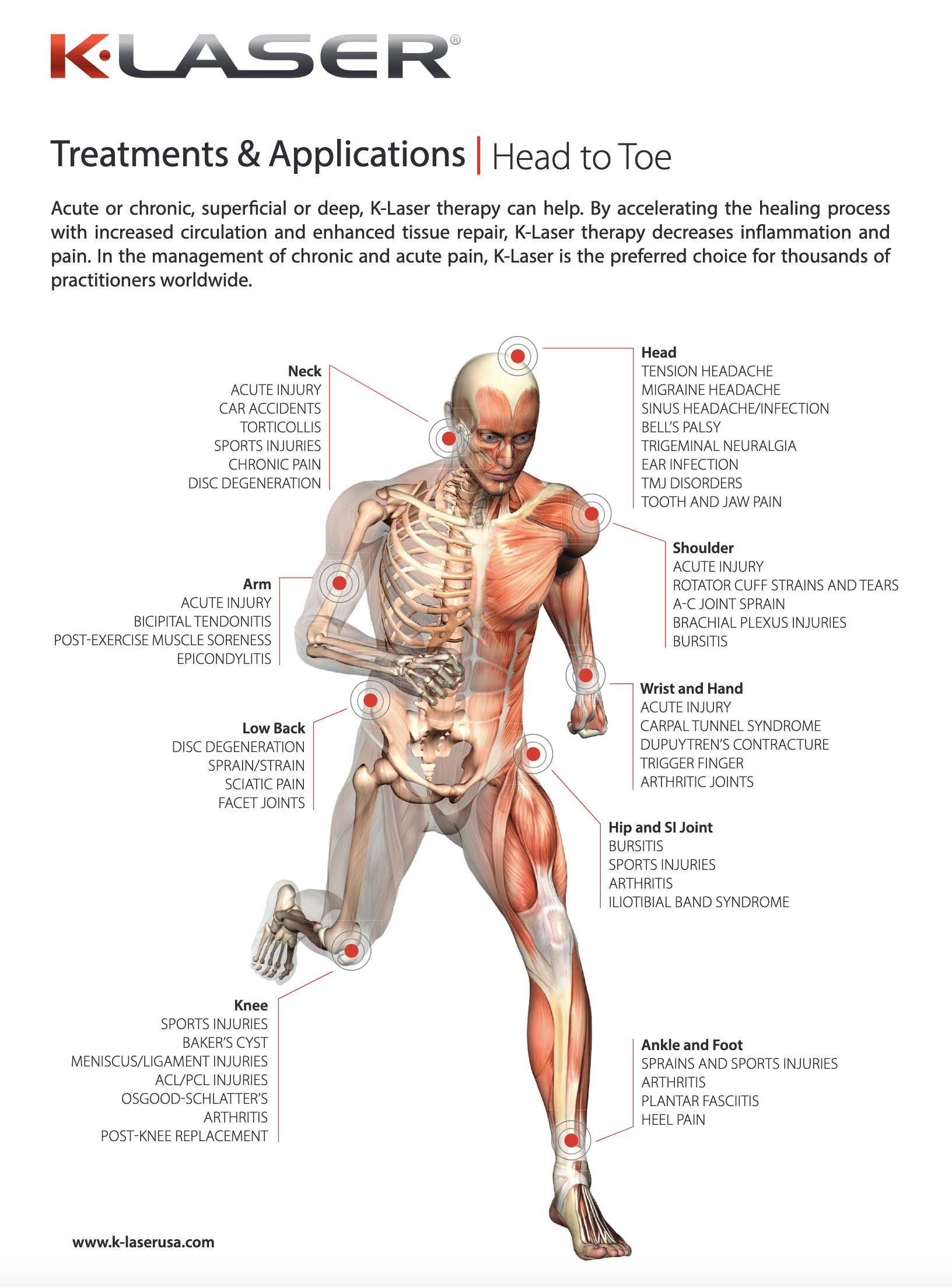Whether you’re dealing with a new injury, or you’ve been suffering with chronic pain for some time, we invite you to try K-laser therapy for pain relief—A natural healing alternative to treat injuries, arthritis, wound care, migraines and more—Check out the Treatments & Applications diagram for more detail.
